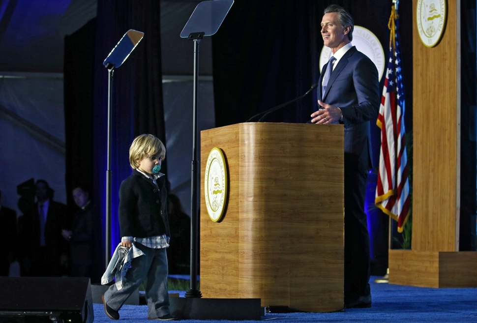 개빈 뉴섬 미국 캘리포니아 주지사가 1월7일 캘리포니아 새크라멘토 주의회 의사당에서 취임 선서를 한 뒤 연설하는 동안, 두 살배기 아들 더치가 ‘공갈젖꼭지’를 입에 문 채 발언대 둘레를 돌아다니고 있다. 네 아이의 아빠인 뉴섬 지사는 연방정부가 국경 지역에 세우는 장벽을 겨냥해 “정치인들이 절대 건설해서는 안 되는 벽에 수십억달러를 쏟아부으려는 동안, 아이들은 굶주리고 있다”고 말했다. 또 “우리는 부모들이 아이들에게 필요한 사랑과 보살핌을 줄 수 있도록 지원할 것”이라고 다짐했지만, 도널드 트럼프 대통령의 이름은 한 번도 거론하지 않았다. 트럼프 대통령은 1월9일 트위터로 “캘리포니아의 대형 산불은 주의 관리 부실이 원인”이라며 “연방 차원의 산불 복구 지원금을 중단할 계획”이라고 엄포를 놓았다.