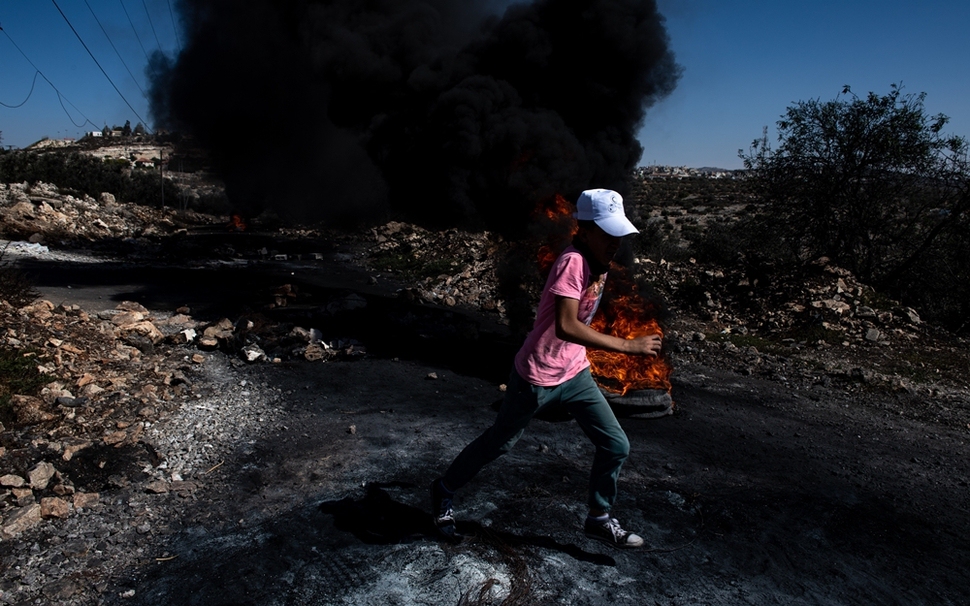 쿠프르카둠 마을은 나블루스 북쪽에 있다. 검은 연기 너머로 불법 정착촌이 있으며, 정착촌 보호를 명목으로 이스라엘 군대가 주둔한다.