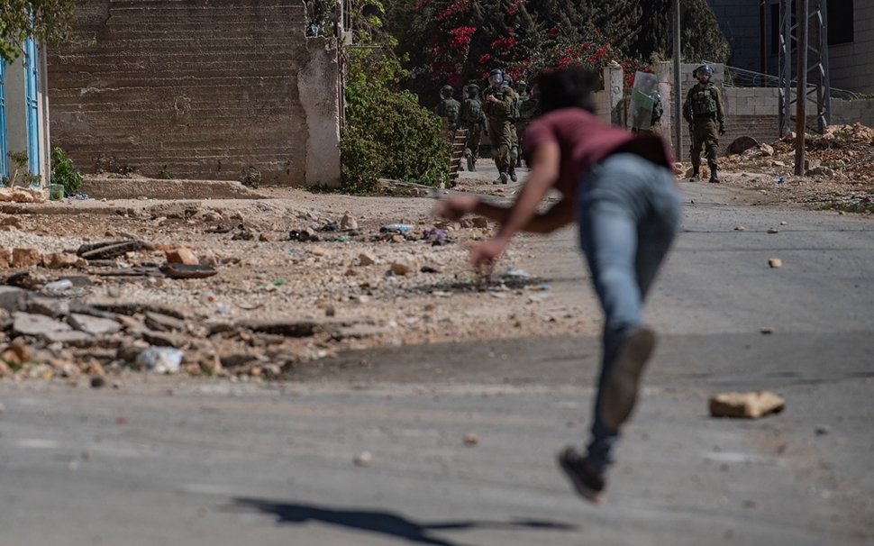 쿠프르카둠 마을 주민들이 금요일 점심 기도 뒤 집회를 하던 중 마을로 진입한 이스라엘 군인들에게 돌을 던지며 맞서고 있다.