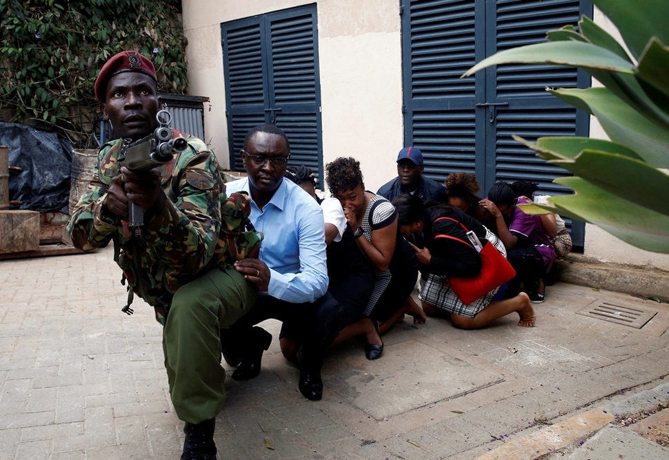 케냐 나이로비 도심에서 총격과 폭탄 테러가 일어난 1월15일, 총격전이 벌어진 호텔 복합건물 주변에서 호텔 이용객들이 보안 요원의 엄호를 받으며 대피하고 있다. 이 테러로 21명이 숨졌다. 희생자 중에는 2011년 미국 9·11테러 생존자 제이슨 스핀들러가 포함된 것으로 알려졌다. 그는 9·11테러 당시 뉴욕 세계무역센터(WTC) 살로먼스미스바니 은행에 근무하고 있었다. 소말리아계 이슬람 무장단체 알샤바브는 이 테러가 자신들이 벌인 일이라 주장했고, 테러 용의자 5명은 모두 현장에서 자폭하거나 사살됐다.