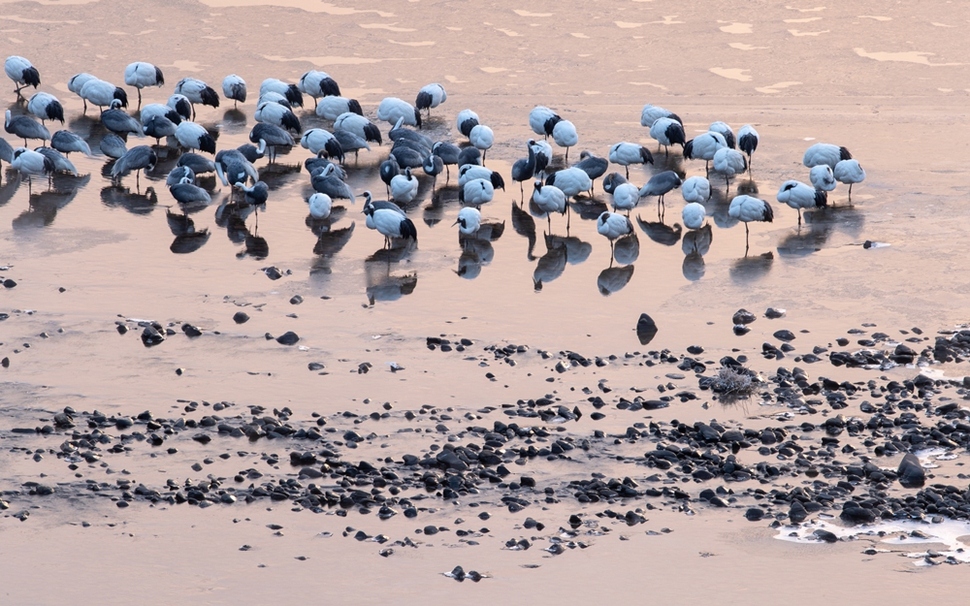 한겨울에도 얼지 않는 임진강과 한탄No강.1 2여4울8은 천적을 피할 수 있어 두루미들이 좋아하는 잠자리다. 두루미와 재두루미 무리가 임진강 여울에 발을 담그고 잠든 1월22일 새벽, 여명에 강물이 붉게 물들었다.