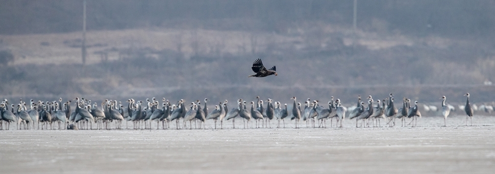 강원도 철원에서 겨울을 나는 재두루미 무리 위로 함께 밤을 새운 어린 흰꼬리수리가 날아가고 있다.