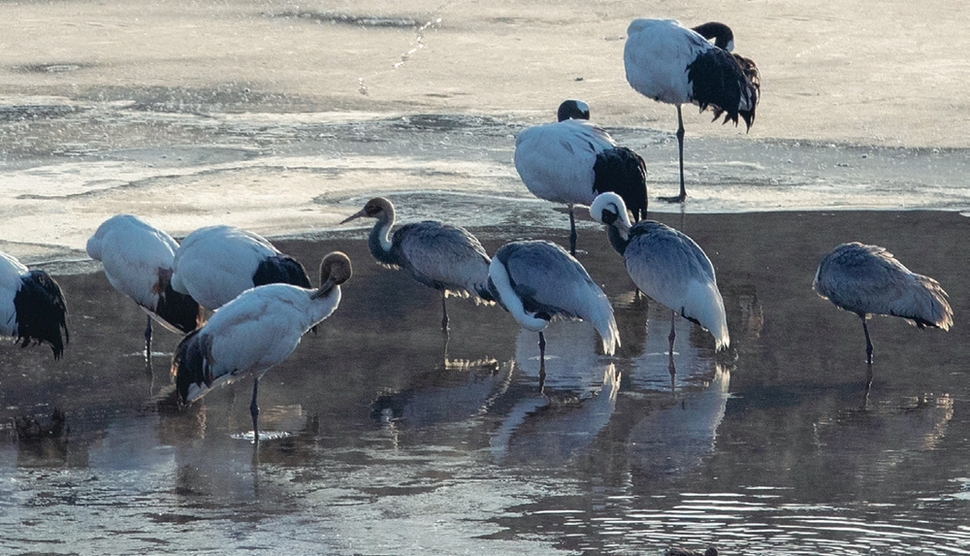 강물에 외다리로 선 두루미와 재두루미 다리에 밤새 얼음 발찌가 채워졌다.