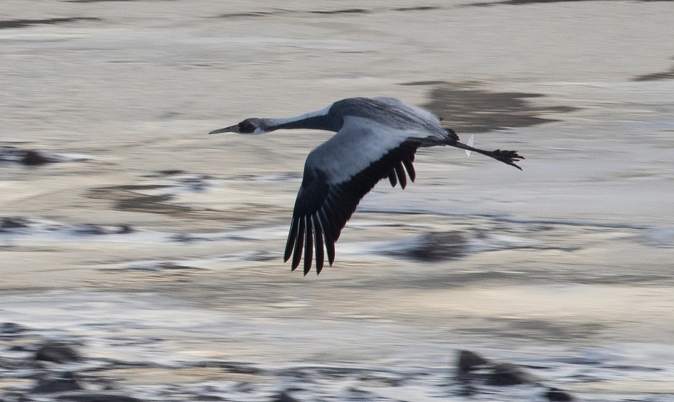 다리에 얼음 발찌를 매단 채 잠자리를 차고 날아오른 재두루미.