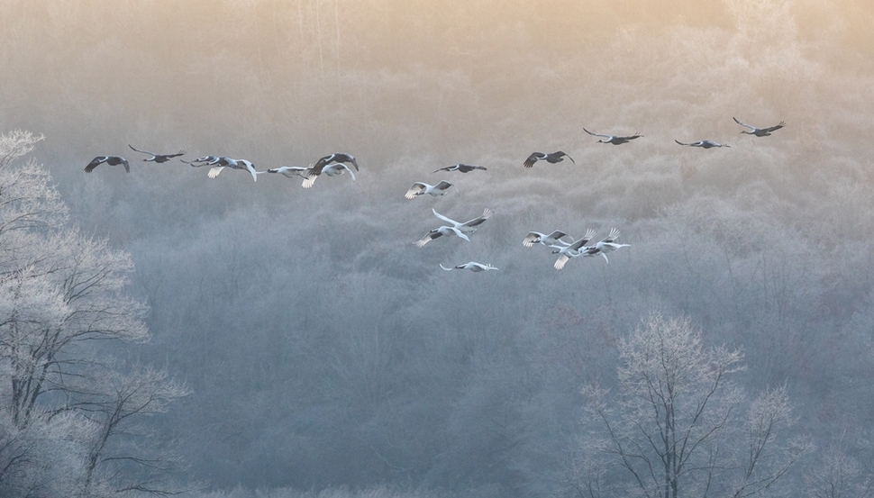 산 너머로 해가 떠오르자 잠에서 깬 두루미와 재두루미가 무리를 지어 날아가고 있다. 밤새 수증기가 그대로 얼어붙어 강변 나뭇가지에 상고대가 화려하게 피었다.