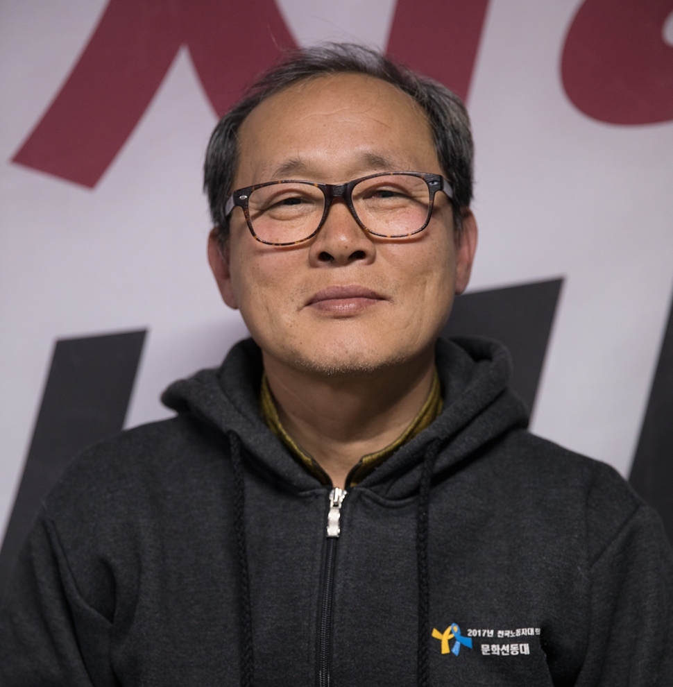 복직투쟁 4382일. ‘끝장투쟁’을 알리는 집회에 앞서 임재춘씨(오른쪽)가 민중가수 박준씨와 노래를 부르고 있다.