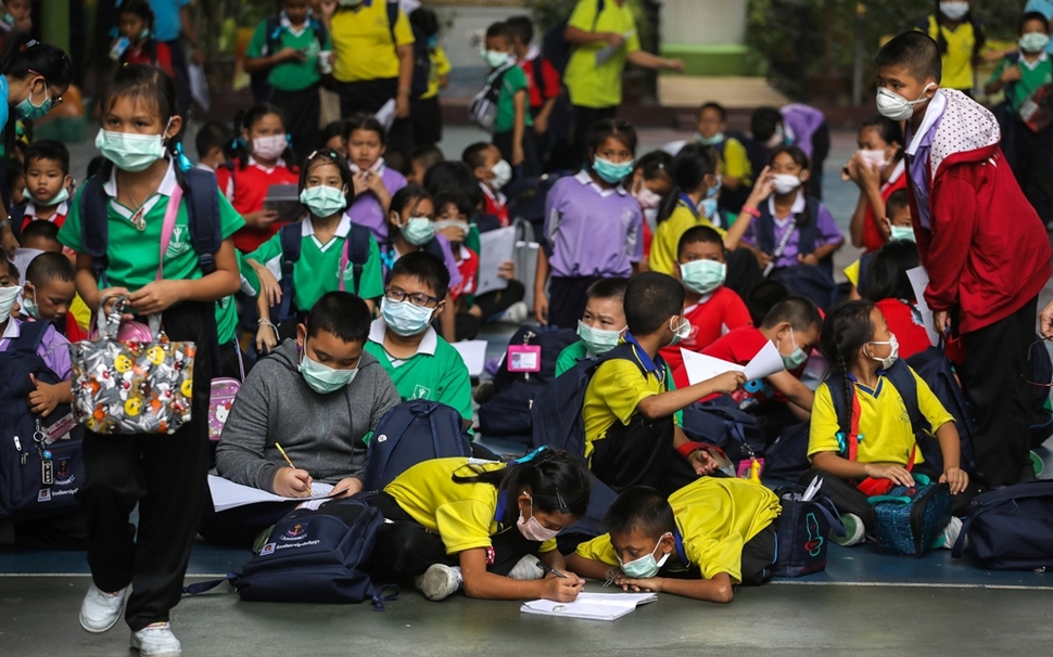 1월30일 최악의 초미세먼지로 휴교령이 내린 타이 방콕의 한 공립학교에서 학생들이 마스크를 쓴 채 집에 돌아가려고 차를 기다리고 있다. 일부 학생은 이 와중에도 바닥에 엎드려 공부하고 있다. 타이 교육부는 방콕과 주변 5개 도시의 국·공립학교 437곳에 휴교령을 내렸다. 이들 학교는 2월1일까지 문을 닫는다. 타이는 높은 인구밀도와 자동차 매연으로 대기질이 좋지 못한데, 중국에서 넘어온 미세먼지까지 겹치며 앞이 보이지 않을 정도로 공기가 나빠진 상황이다. 인공강우와 물대포, 농업용 드론까지 동원해 물을 뿌렸지만 별다른 효과를 거두지 못하고 있다.