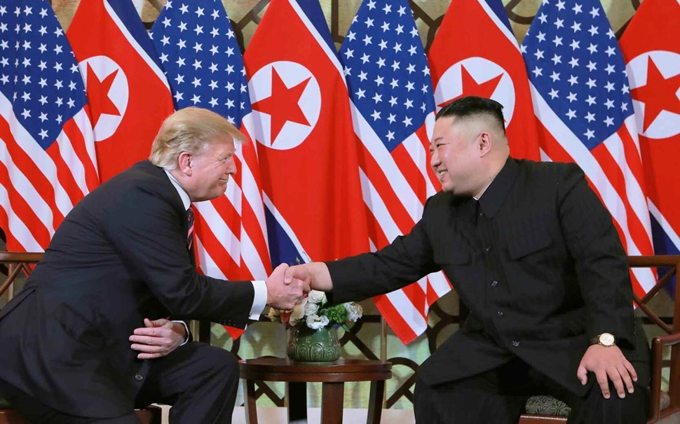 김정은 북한 국무위원장과 도널드 트럼프 미국 대통령이 2월27일 저녁 소피텔 레전드 메트로폴 호텔에서 8개월여 만에 다시 만나 웃으며 악수하고 있다.