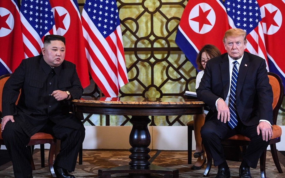 2월28일 오전 베트남 하노이 소피텔 레전드 메트로폴 호텔에서 열린 북-미 확대정상회담에서 도널드 트럼프 미국 대통령(왼쪽 셋째)과 김정은 북한 국무위원장(오른쪽 둘째)이 무거운 표정을 짓고 있다. ‘리비아식 해법’을 주장해 ‘수퍼 매파’라 하는 존 볼턴 백악관 국가안보보좌관(맨 왼쪽)은 웃고 있다.