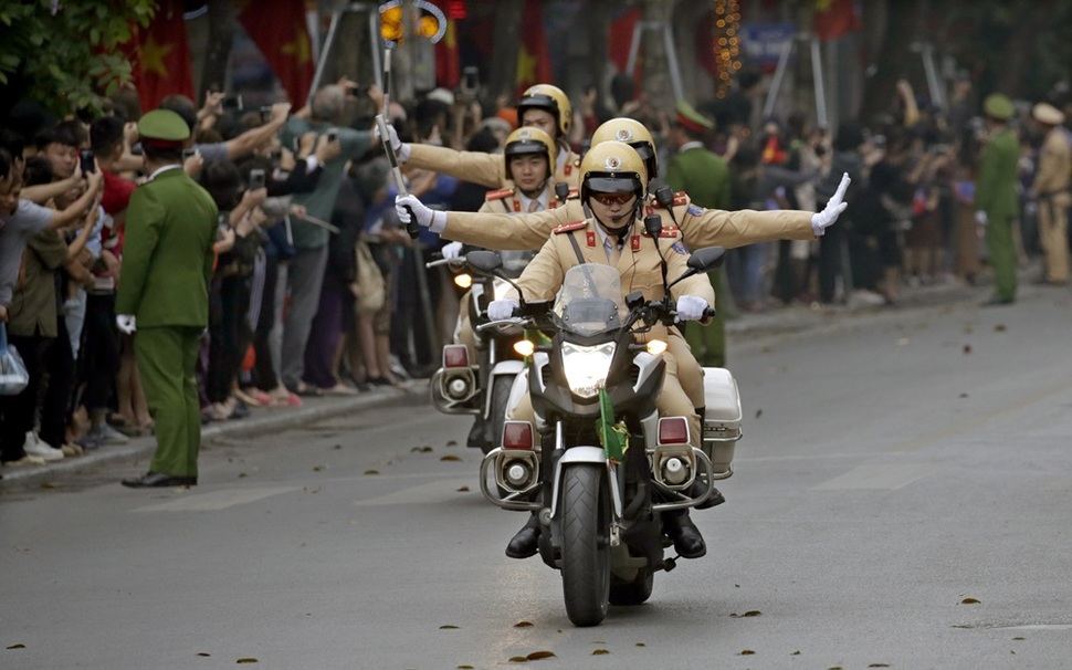 베트남 교통경찰이 2월28일 낮 북-미 정상회담이 예정보다 일찍 끝나자 두 정상의 차량 행렬이 지나기에 앞서 회담장 주변에서 교통 통제를 하고 있다.