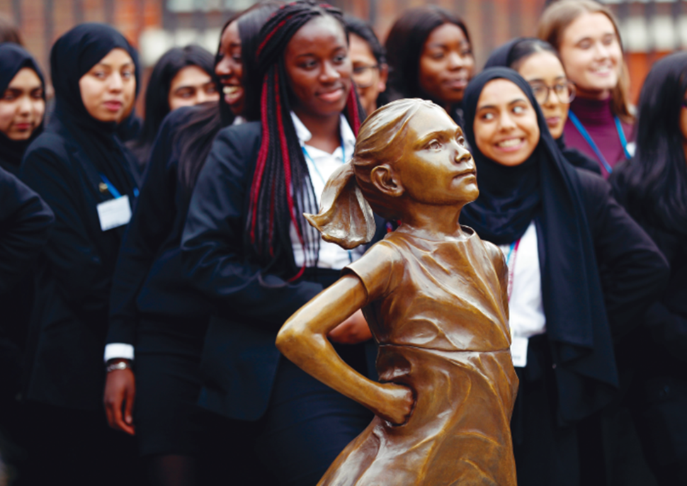 세계 여성의 날(3월8일)을 사흘 앞둔 3월5일 영국 런던 금융가 스테이트 스트리트에 ‘두려움 없는 소녀상’이 등장했다. 히잡을 쓴 한 무슬림 여학생이 소녀상의 몸짓을 흉내 내며 웃고 있다. 허리에 양손을 올린 채 고개를 치켜든 소녀의 당찬 모습은 2017년 3월 미국 뉴욕의 금융 중심지인 월가에 등장해 큰 관심을 모았다. 조각가 크리스틴 비스벌의 작품이다. 영국에 세운 동상은 뉴욕 동상을 본떠 만들었다. 두려움 없는 소녀들 앞에 ‘두려울 일 없는’ 세상이 펼쳐지길 기대한다.