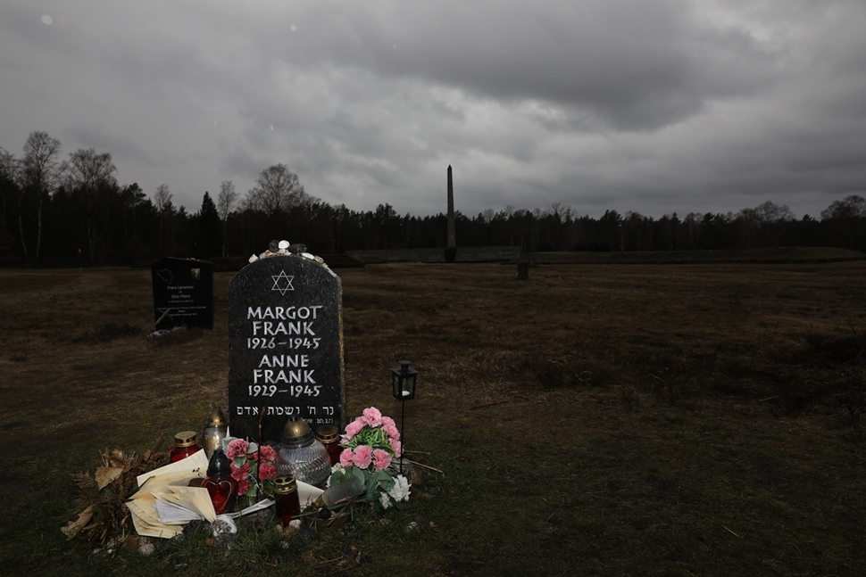 안네 프랑크가 언니와 함께 숨진 독일 하노버 외곽 첼레의 베르겐벨젠 강제수용소에 세워진 묘비. 뒤쪽에 1천여 명씩 집단으로 묻힌 거대한 무덤들이 흩어져 있다.