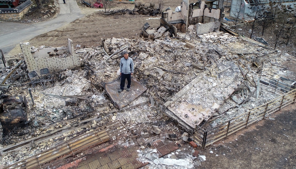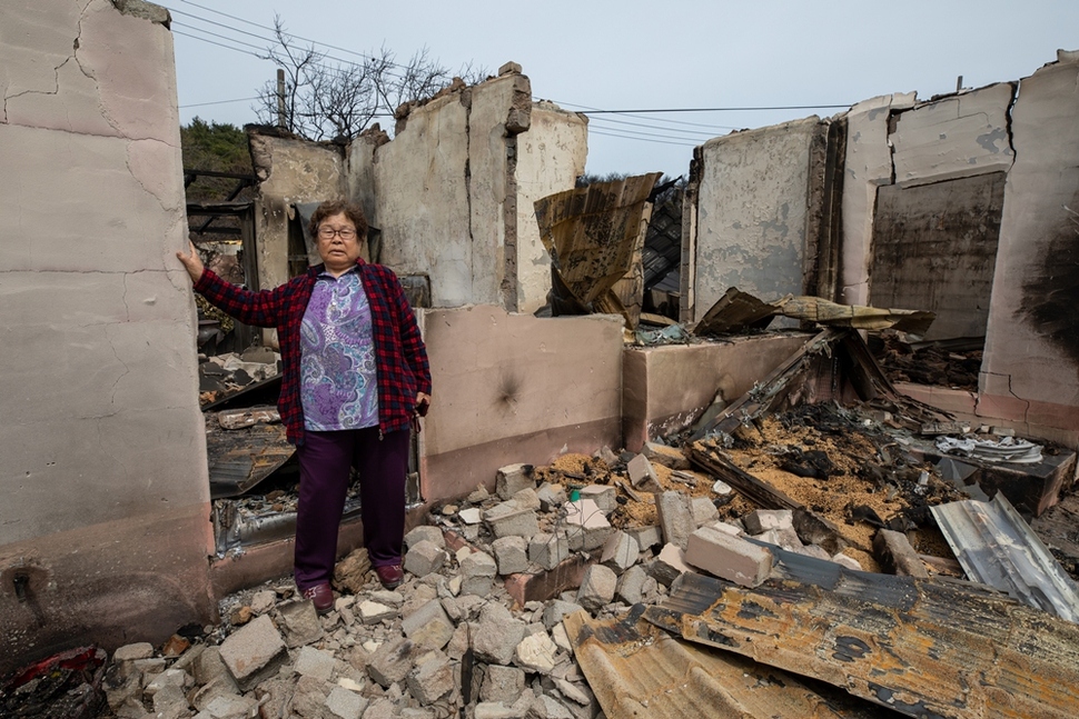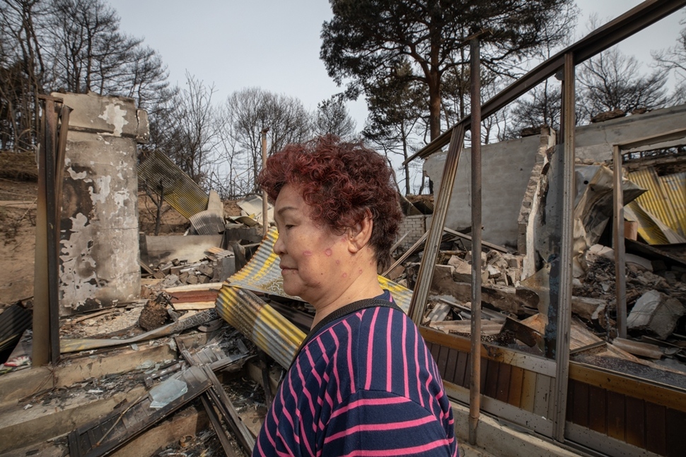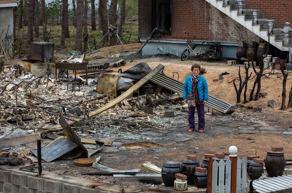 강원도 속초 시내에서 살다 이사 와 새로 지은 김은희(70)씨 집은 마당에 장독과 재만 남았다. 남편 김홍식씨는 불을 피하다 다쳐 속초의료원에 입원했다.
