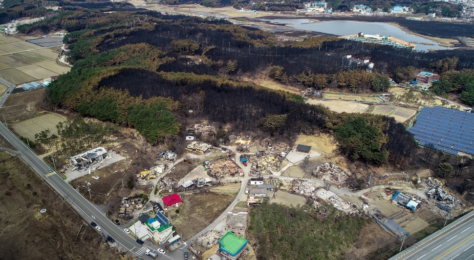 산불이 휩쓸고 간 강원도 고성군 토성면 용촌2리 전경. 산불이 옮겨다닌 자리가 검은 뱀처럼 마을 주변을 휘감고 있다. 마을회관 등 일부 건물을 남기고 모두 불에 타 폐허로 변했다.