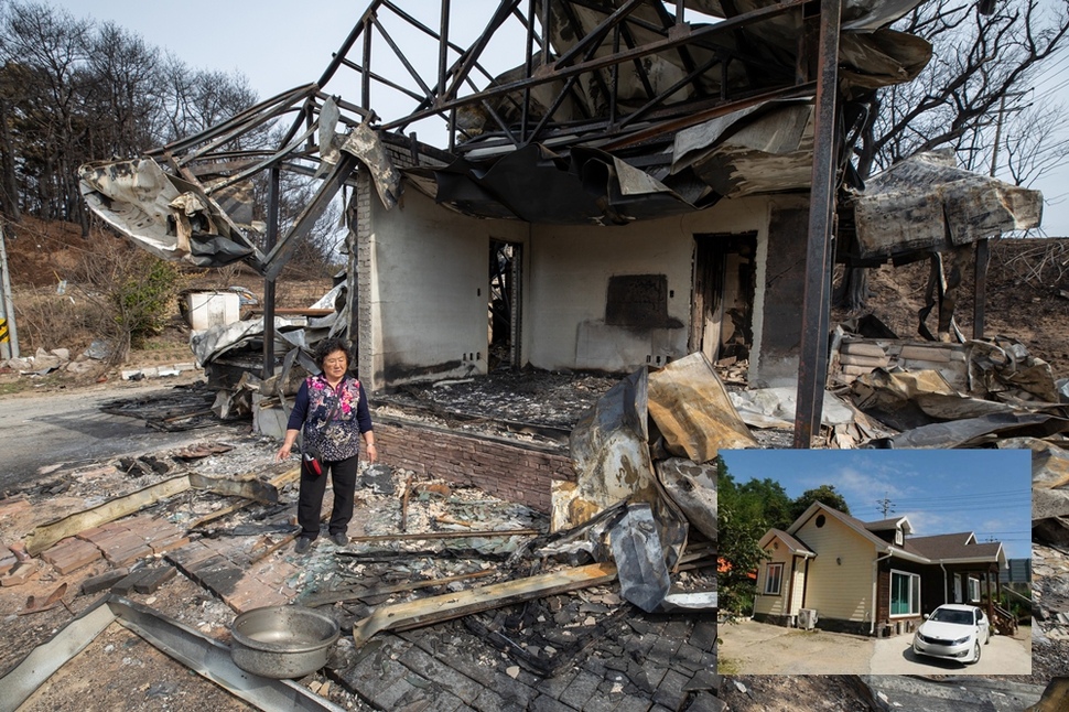 함영순(63)씨가 4월9일 불에 타 폐허가 된 자신의 집 앞에 서 있다. 혼자 농사일을 하는 함씨는 기르던 소 세 마리를 데리고 겨우 몸만 빠져나왔다. 강풍을 타고 밀어닥친 불을 피하다 소 한 마리를 잃었다. 작은 사진은 카카오맵 로드뷰에서 갈무리한 화재 전 함씨의 집.