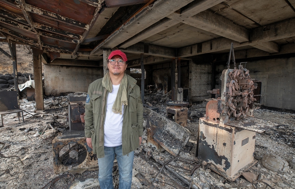 캔버스에 와이어(철사)를 꽂아 작품을 만들어온 조각가 김용진(55)씨도 산불에 살던 집과 작업실을 모두 잃었다. 작업에 전념하기 위해 새로 정착한 용촌2리는 주변에 감나무와 대추나무가 어우러져 가을에 더 아름다운 마을이다.