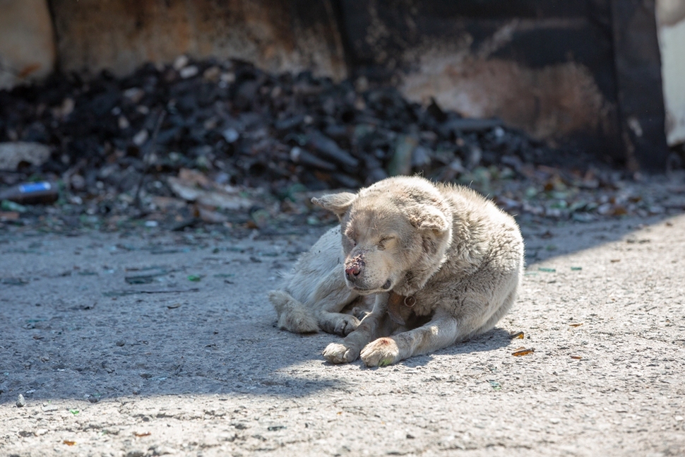 강풍을 타고 번진 불에 얼굴 등 온몸이 불에 덴 개가 힘없이 앉아 있다.