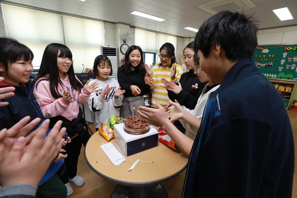 6학년 교실에서 4월에 생일을 맞은 담임교사와 한 학생의 생일잔치가 열렸다.