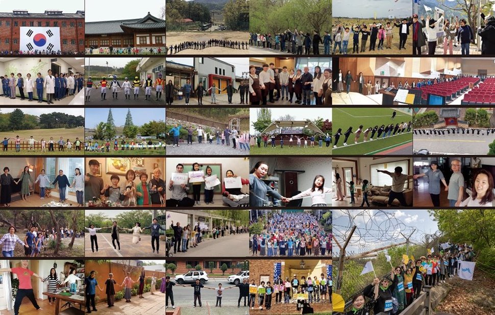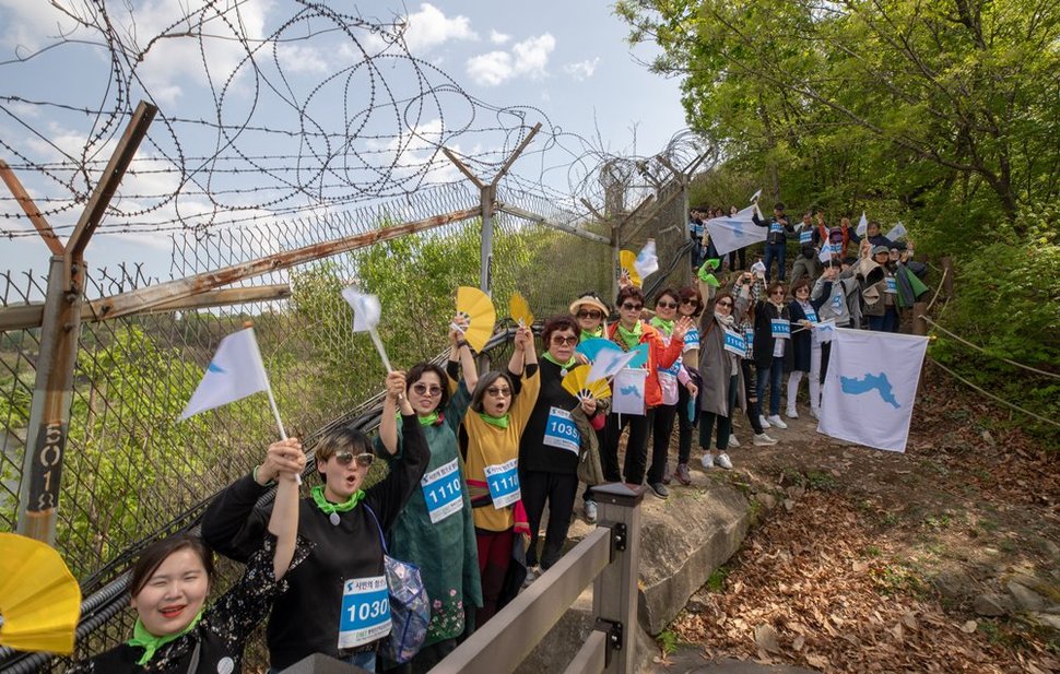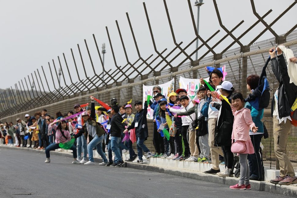 경기도 파주 임진각 평화누리에서 율곡습지공원까지 이어지는 생태탐방로(약 9㎞)에 나란히 줄지어 선 시민들이 4월27일 오후 2시27분 서로 손을 맞잡아 들어올리고 있다.