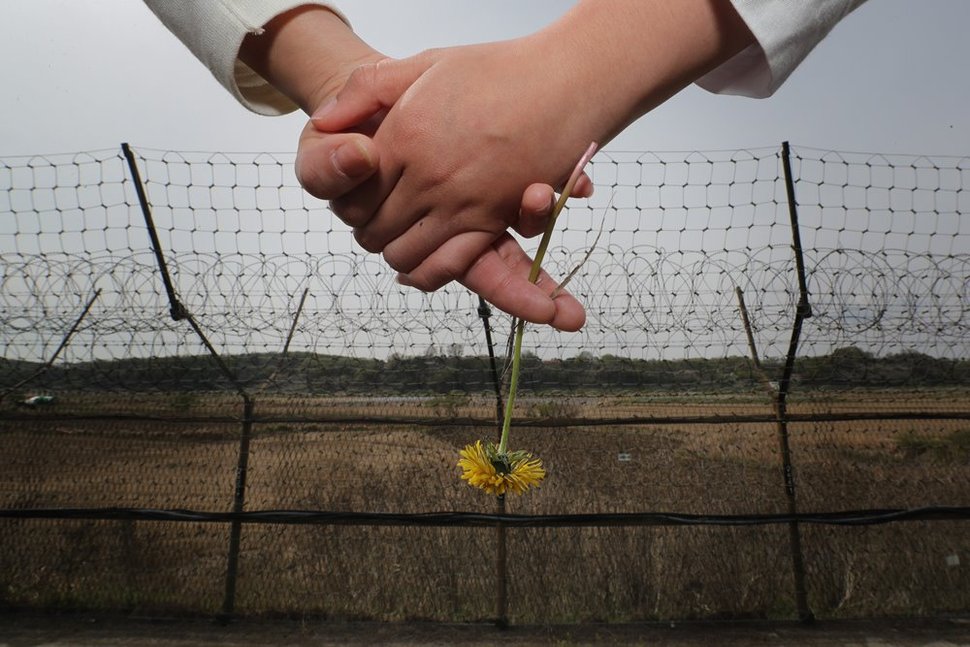 임진강 남쪽을 가로막은 철책 앞, 시민들이 맞잡은 손에 민들레꽃 한 송이가 들려 있다.