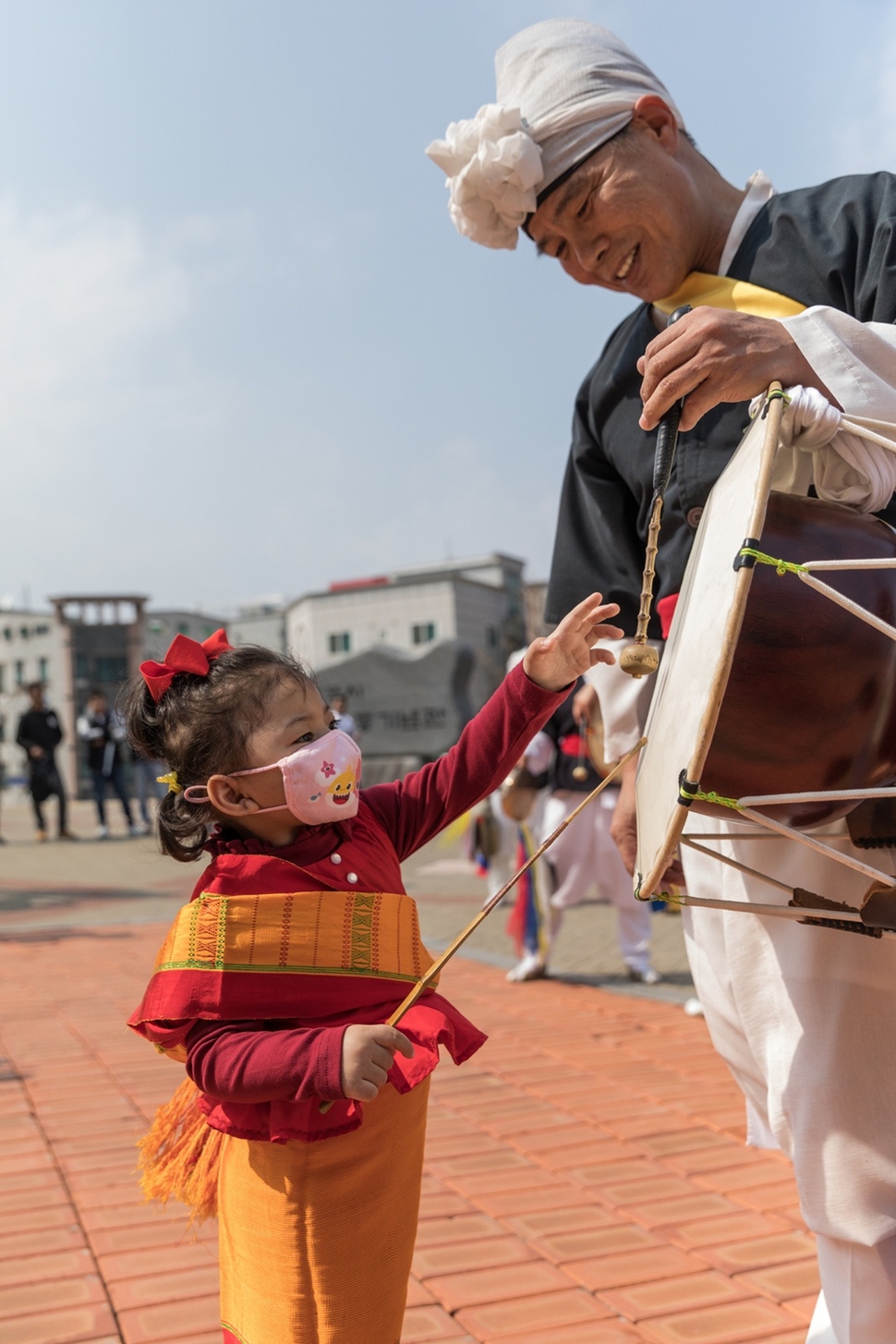 줌머 어린이가 호기심 가득한 눈빛으로 길놀이를 하는 주민 풍물패의 장구를 만져보고 있다.