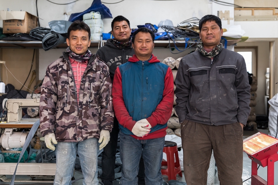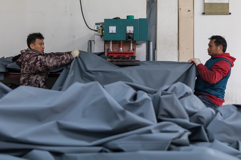 박민수씨(왼쪽)가 공장 직원과 함께 천막을 만들고 있다. 그는 지난해 사업자등록을 한 사장님이다.