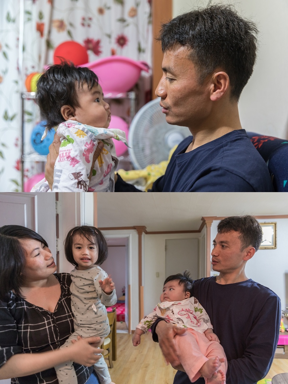 생후 두 달 된 둘째 아이를 바라보는 박민수씨. 줌머인의 정체성을 잊지 않기를 바라며 아기 이름을 줌머 이름인 ‘박디골’로 지었다.(위) 박민수씨 가족. 2009년 박씨와 결혼한 아내 수미따는 인도 국적의 줌머인이다.