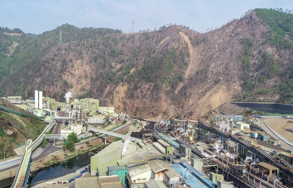 (주)영풍 석포제련소 공장 주변 산에 나무가 까맣게 말라 죽고, 산비탈 흙이 강으로 흘러내리고 있다. 나무와 풀이 죽어가자 경사지 땅도 빠르게 훼손되고 있다. 제련소 공장 굴뚝에서는 연기가 쉼 없이 뿜어져 나온다.