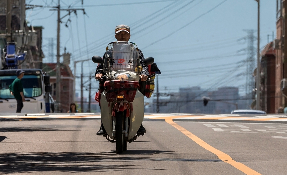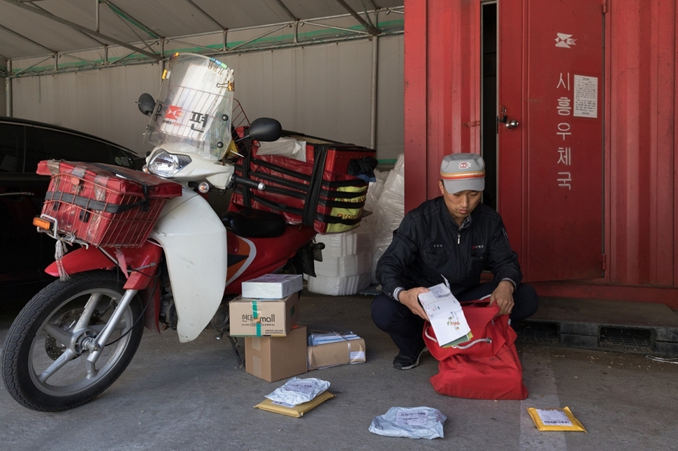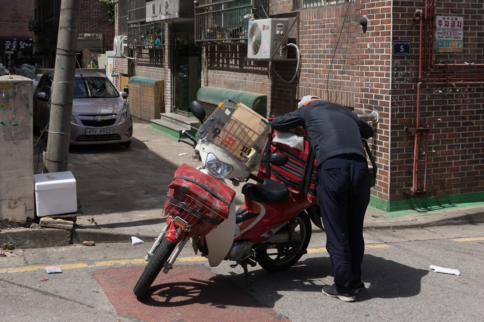 엘리베이터가 없는 다세대주택 계단을 뛰어다니며 등기우편물을 전달한 강씨가 오토바이에 기대 숨을 돌리고 있다. 그 와중에도 다음 등기 수령자와 통화한다.