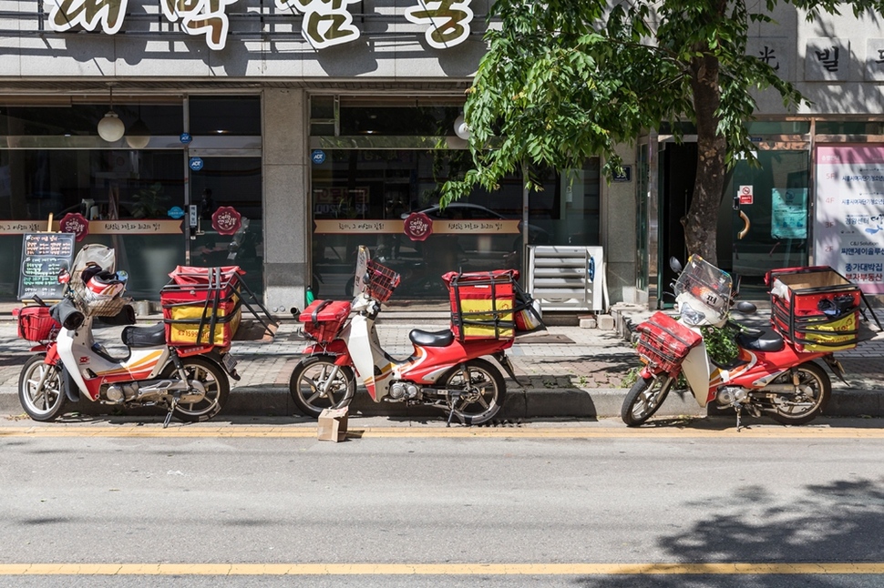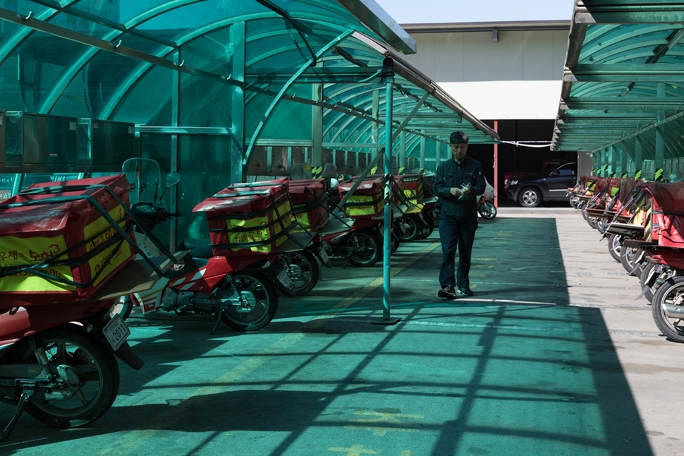 식당 앞에 나란히 서 있는 집배원 오토바이들. 배달 중에는 마음이 급해 식사를 제대로 할 수 없다. 우편물 배달을 다 끝낸 4시께 주변 동료들과 때늦은 점심을 먹는다.