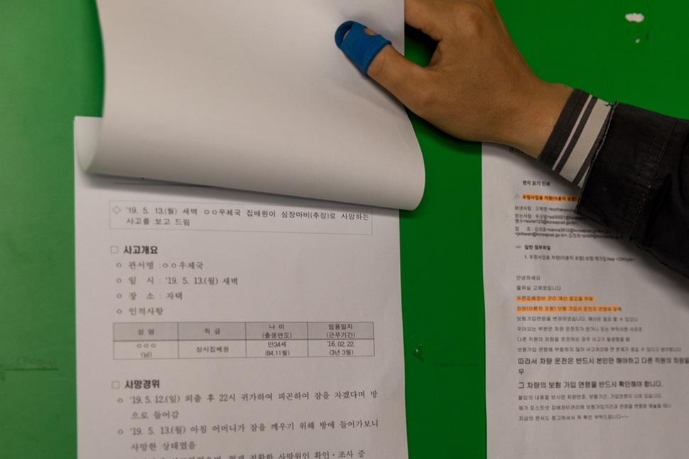 우체국 안 게시판에는 5월12·13일 이틀간 숨진 집배원 3명에 대한 보고서가 붙어 있다.
