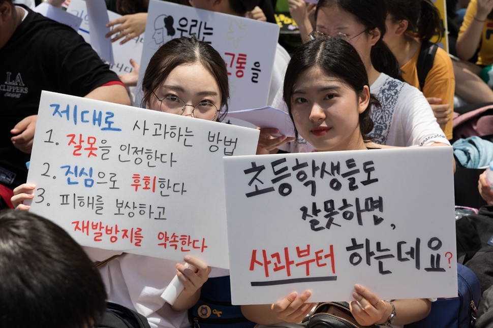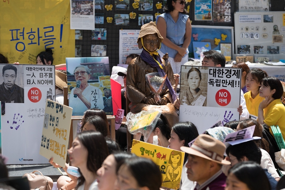 서울 종로구 중학동 주한 일본대사관 앞 수요집회 참가자들이 일본 정부의 사과를 촉구하고 있다.