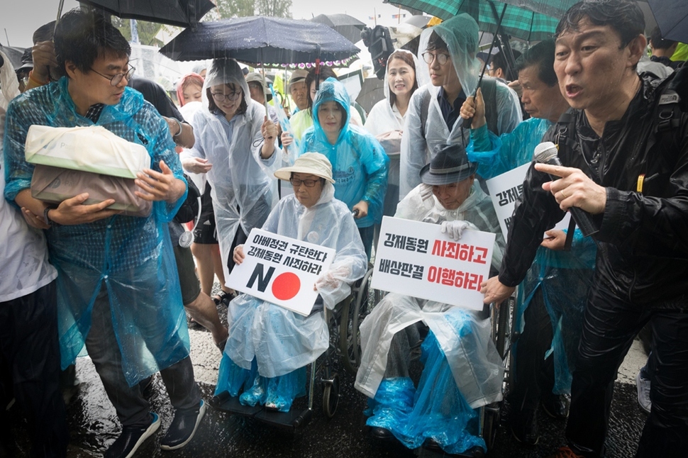광복 74돌을 맞아 8월15일 서울 태평로 서울광장에서 열린 ‘일본 강제동원 문제 해결을 위한 시민대회’에 참가한 일제 강제징용 피해자와 시민들이 주한 일본대사관까지 평화행진을 벌였다. 이춘식 할아버지(오른쪽 휠체어 앉은 이)와 양금덕 할머니(왼쪽 휠체어)는 일본 정부의 사죄와 일본 기업의 배상을 요구하는 시민 1만7천 명이 참여한 서명지(맨 왼쪽 보퉁이 두 개)를 직접 전달하려고 빗속에서 기다렸지만, 일본대사관 쪽에선 끝내 아무도 나오지 않았다.