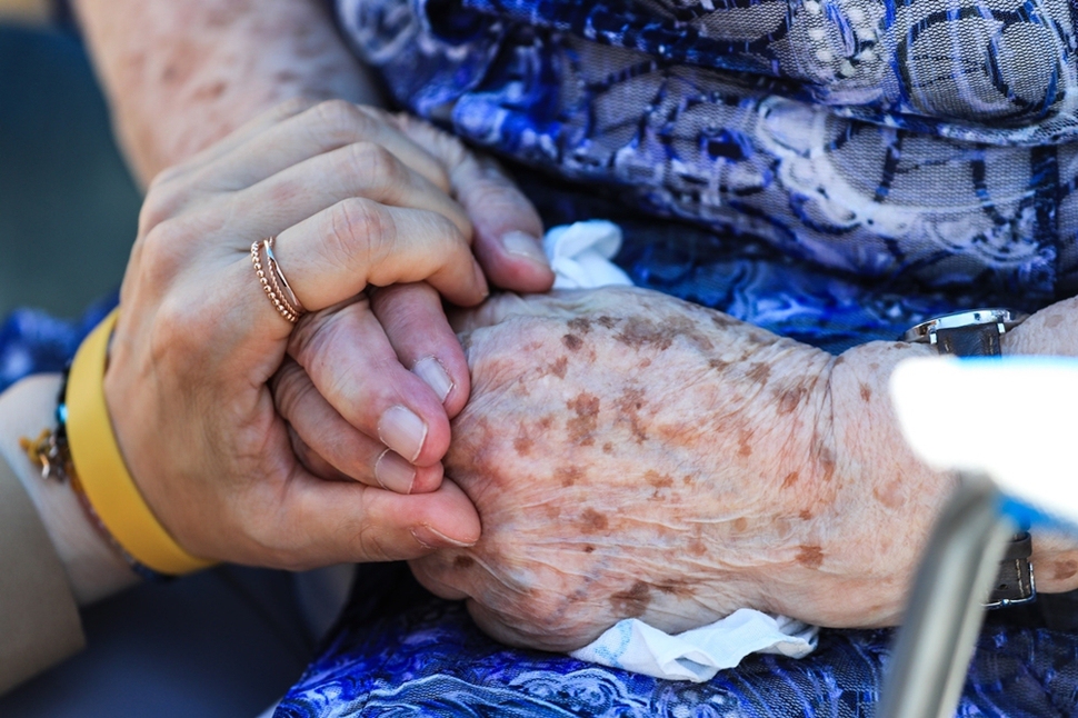 수요집회에 참가한 한 시민이 함께 자리한 일본군 성노예제 피해자 길원옥 할머니의 손을 잡고 있다.