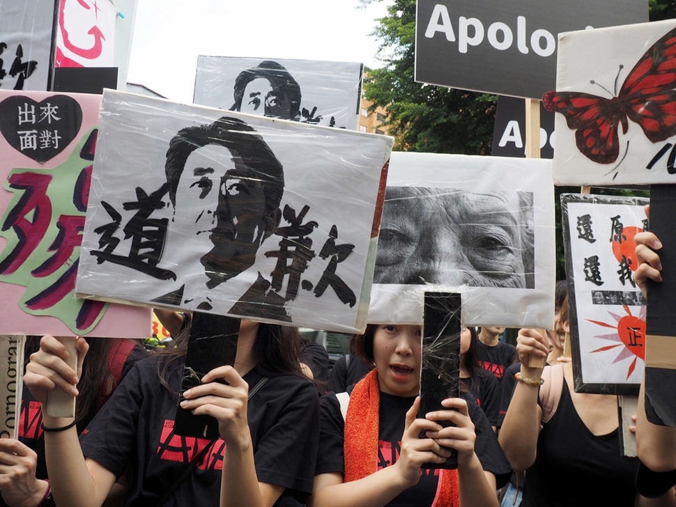 1400차 수요집회는 우리나라 외에 9개 나라 21개 도시에서 함께 열렸다. 8월14일 대만 타이베이에서 시민들이 아베 신조 일본 총리의 사죄를 요구하고 있다.