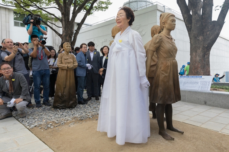 일본군 성노예제 피해자 이용수 할머니가 8월14일 서울 남산 옛 조선신궁 터 앞에 세워진 ‘위안부 피해자 기림비’ 한국·중국·필리핀 소녀상 사이에 들어가 이들의 손을 잡고 있다. 기림비를 제작한 미국인 조각가 스티븐 와이트는 누구나 소녀들과 손을 잡고 설 수 있도록 빈자리를 배치했다. 2017년 최초로 위안부 기림비를 세운 미국 샌프란시스코 교민들이 현지에서 제작해 서울시에 기증했다.