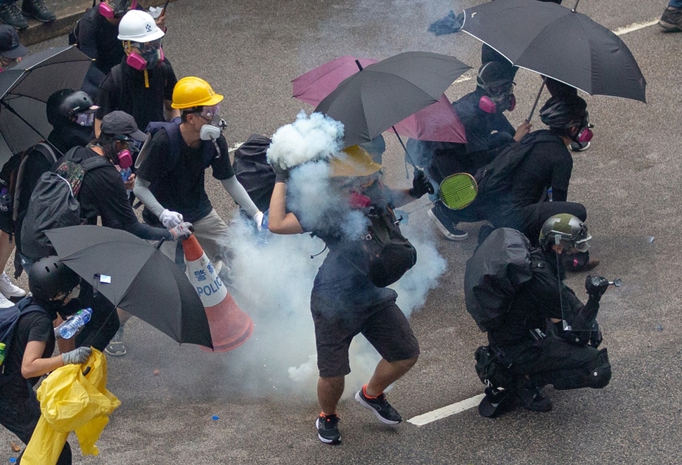 8월31일 홍콩 정부청사 앞에서 경찰과 시위대가 충돌했다. 경찰이 쏜 최루탄을 집어든 시민이 다시 경찰을 향해 던지고 있다.