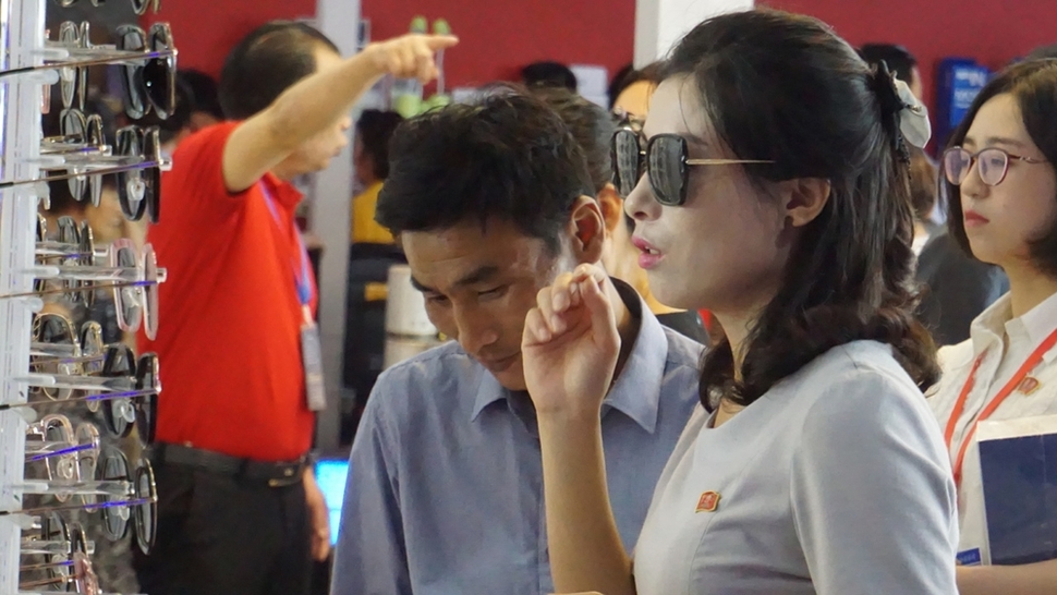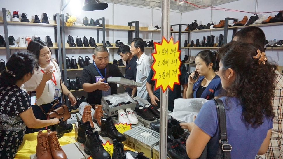 북한 평양 시민들이 9월6일 양각도 ‘국제첨단기술상품전람회’를 찾아 신발 코너에서 구두, 운동화, 부츠 등을 살펴보고 있다. 판매원의 손에 들린 휴대용 선풍기와 달러로 적힌 가격표가 눈에 띈다.
