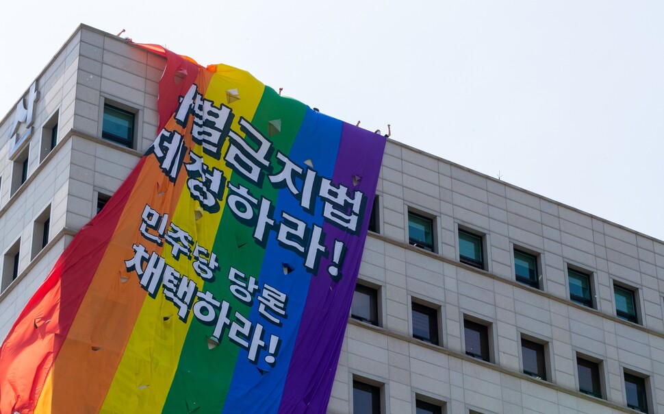 차별금지법제정연대 인권활동가 10여 명이 2022년 4월26일 서울 여의도동 국회 앞 금산빌딩 옥상에 올라 차별금지법 제정을 촉구하는 무지개색 대형 펼침막을 내걸고 있다. 4월 임시국회 회기 안에 차별금지법 제정을 요구하며 단식을 이어가는 이종걸·미류 인권활동가를 응원하고, 다수당이면서 법 제정에 미온적인 더불어민주당을 압박하려는 기습행동이다. 펼침막은 경찰과 건물 관리자의 제지로 10여 분 만에 내려졌다.