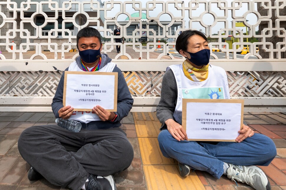 서울 여의도동 국회 앞에서 차별금지법 제정을 호소하는 인권활동가 두 명이 단식을 이어가고 있다. 2022년 4월11일부터 단식농성에 들어간 이종걸 차별금지법제정연대 공동대표와 미류 인권운동사랑방 상임활동가가 그들이다.