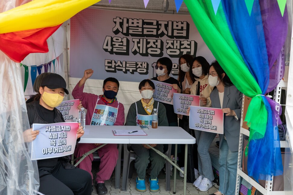 차별금지법은 성별·장애·병력·나이·출신국가 등 어떤 이유로도 차별받지 않을 것을 명문화한 법이다. 2007년 노무현 정부 시절에 처음 발의된 뒤 15년간 발의와 폐기가 반복됐고, 현재도 제정안 4건이 국회에 계류 중이다. 국회 앞 농성장에선 매일 오전 11시에 사회단체들의 차별금지법 제정 촉구 기자회견이 열리고, 저녁 7시엔 여러 종교단체의 기도회와 문화공연, 토론회가 이어진다.