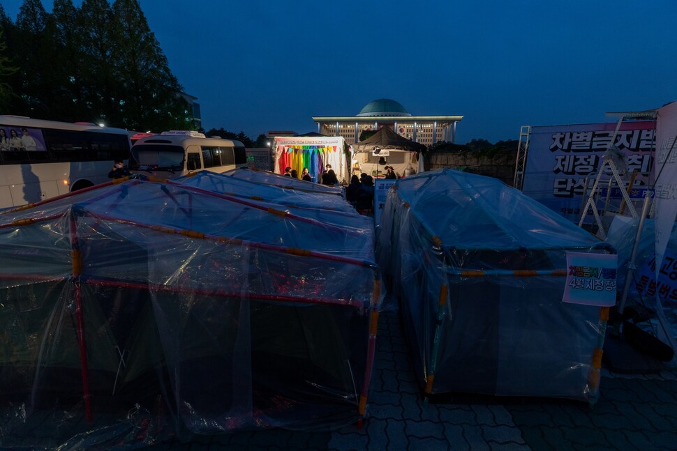 두 명의 활동가가 차별금지법 제정을 호소하며 단식농성 중인 서울 국회 앞 ‘평등 텐트촌’