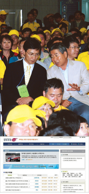 노무현 전 대통령의 발걸음이 바빠지고 있다. 온라인 토론사이트 민주주의 2.0(아래)을 개설하는가 하면 10월1일에는 서울 나들이에도 나설 예정이다. 노사모 모임에서 안희정 민주당 최고위원(위 사진 왼쪽)과 이야기를 나누는 노 전 대통령. 연합 황봉규