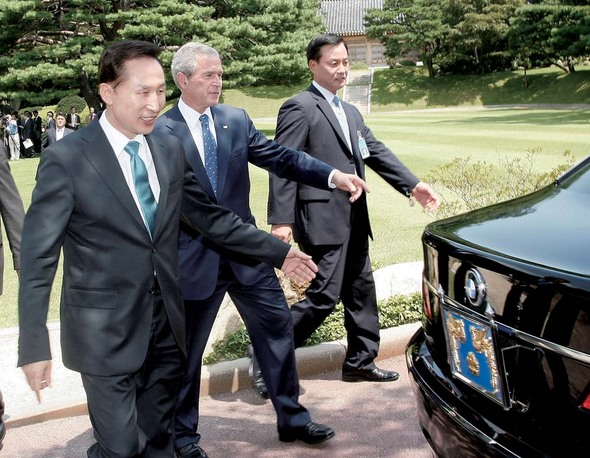올 8월 서울을 방문한 조지 부시 대통령이 이명박 대통령의 리무진에 같이 타기 위해 걸어가고 있다. 미국 대통령이 다른 나라 차량에 탑승한 건 극히 이례적인 일이었다. 청와대사진기자단