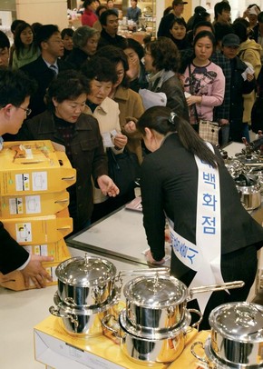 2004년 12월15일 저녁 서울 소공동 롯데백화점에서 개성공단 시범단지에 입주한 주방기기 업체 ‘리빙아트’가 생산한 시제품 판매가 한창이다. 이날 백화점이 문을 닫기까지 두 시간 남짓 동안 팔린 ‘통일냄비’는 무려 480세트나 된다. 한겨레 강창광 기자