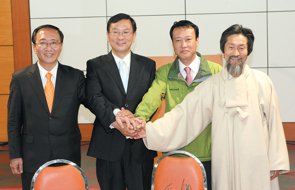 민주노동당 강기갑(맨 오른쪽) 대표와 김창현(왼쪽에서 두번째) 후보, 진보신당 노회찬(맨 왼쪽) 대표, 조승수(왼쪽에서 세번째) 후보가 3월24일 울산 현대자동차 문화회관에서 두 당 후보 단일화 회담에 앞서 손을 모으고 있다. 사진 연합 이상현