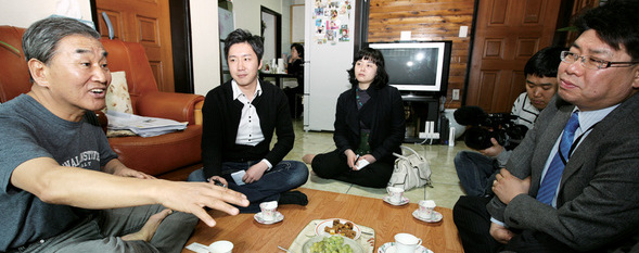 이재오 전 의원이 4월1일 오전 서울 구산동 자신의 집으로 찾아온 그의 기자들과 이야기를 나누고 있다. 이 전 의원은 이날 “당분간 정치적인 이유로 무악재와 한강다리를 넘지 않는다”고 했지만, 지역구와 여의도는 10월 재선거 여부와 여권 권력지형 재편 등으로 술렁이고 있다.