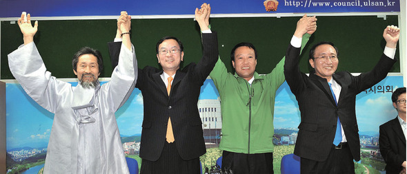 4월23일 오후 민주노동당과 진보신당이 울산 북구 국회의원 재선거 후보 단일화에 최종 합의했다. 단일화 협상을 시작한 지 두 달 만에 얻어낸 결과였다. 왼쪽부터 민노당의 강기갑 대표, 김창현 후보, 진보신당의 조승수 후보, 노회찬 대표. 사진 연합 이상현
