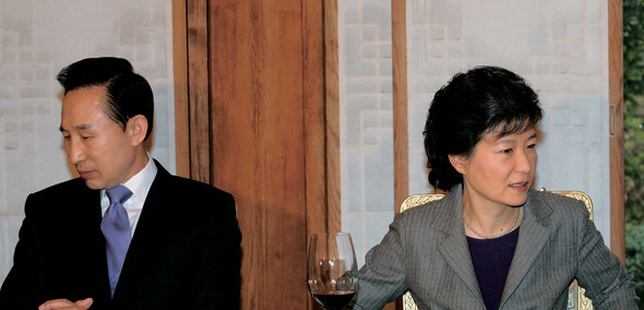 지난 2월2일 이명박 대통령과 박근혜 전 한나라당 대표가 청와대에서 열린 한나라당 최고위원·중진의원 초청 오찬에서 나란히 앉아 어색한 표정을 짓고 있다. 당 안팎에선 이 대통령을 적극적으로 돕지도 않고 반대하지도 않는 박 전 대표의 ‘무위의 정치’가 이 대통령을 향한 불만 탓이라고 해석한다. 사진 청와대사진기자단