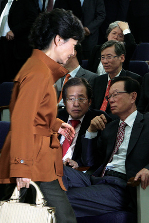 5월21일 한나라당 원내대표 경선에서 안상수 의원이 ‘황우여·최경환’ 조를 꺾었다. 친박 핵심으로 분류되는 최경환 의원의 패배로 박근혜 전 대표(왼쪽)의 당내 입지도 좁아질 전망이다. 사진 한겨레 김봉규 기자